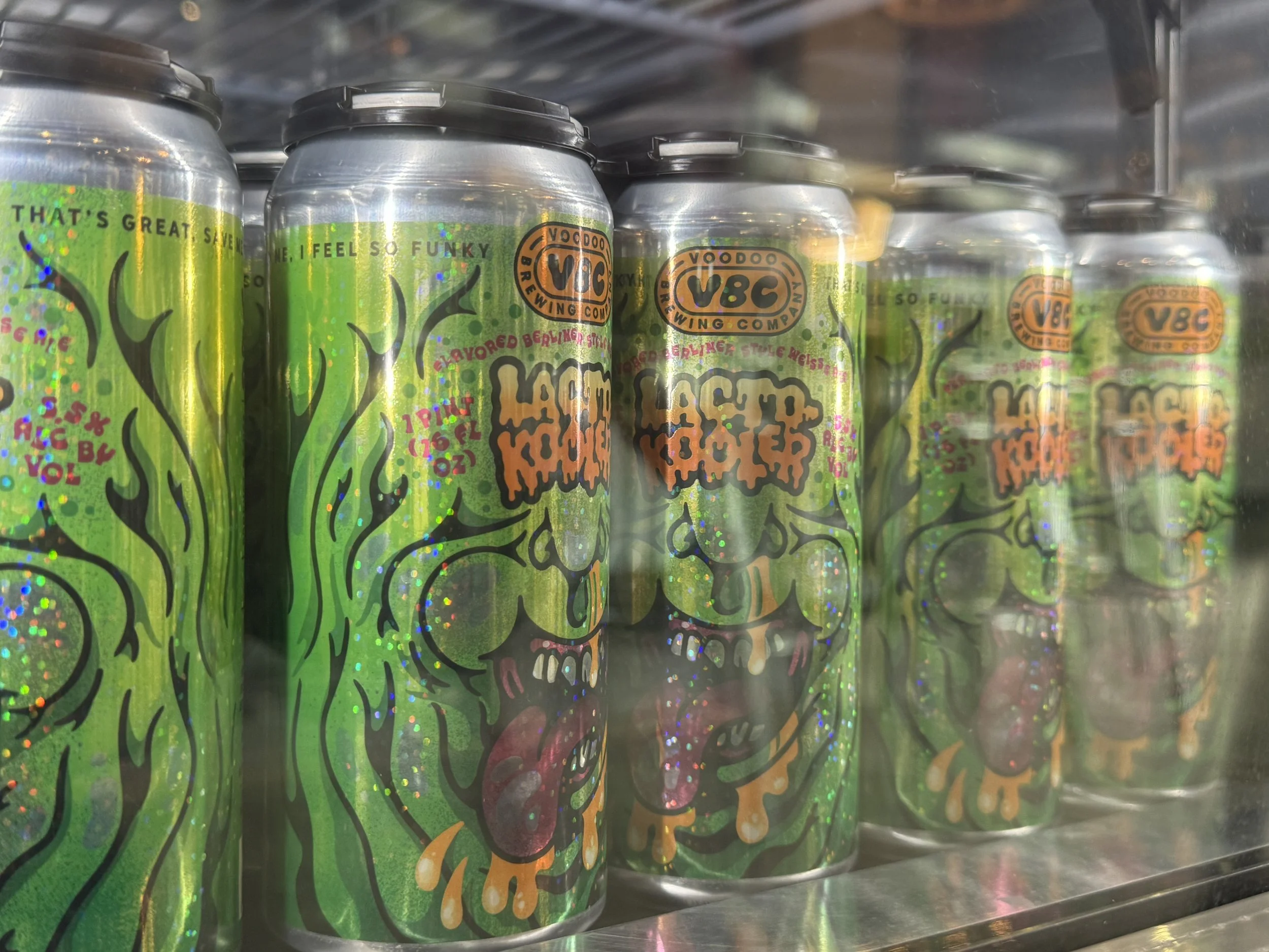 Cans of “Lacto-Kooler” stock the shelves in Voodoo Brewing’s cooler, ready for patrons to take home after a couple of pints at the bar. Photo by Jonathan Guajardo.